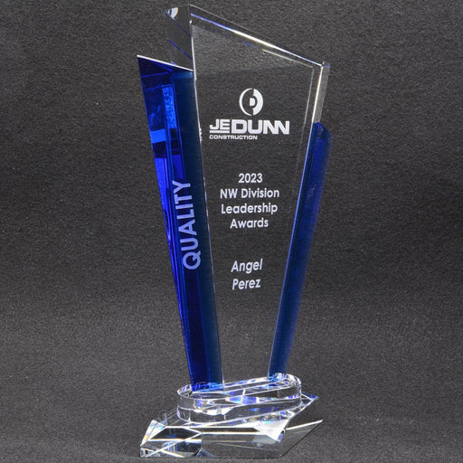 Glass Marquee Award with rising blue beveled edges. Beautifully unique beveled glass base. Foam lined presentation box included. This is a ve...