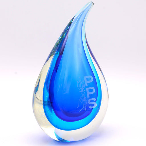 Beautiful Blue Tear Drop Art Glass. Includes lined presentation box. Deep Etch Sand Engraving is included the price. Please email us your person...
