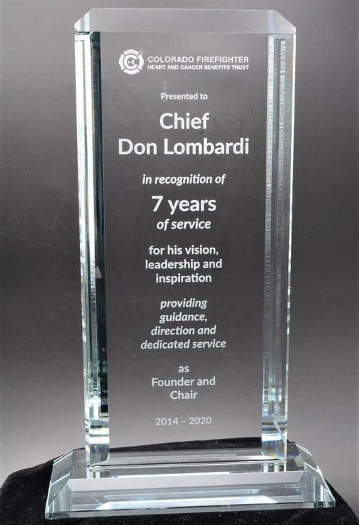 Spectrum Crystal Award with beautiful lined presentation box. Deep Etch Sand Engraving IS INCLUDED in the price. Please email us your personaliza...