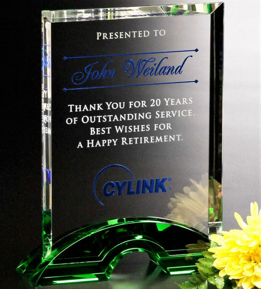 Emerald green or Indigo blue Danbury Rectangle Crystal Award. The colored crystal makes a dramatic appearance. It extends across the award with ...