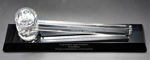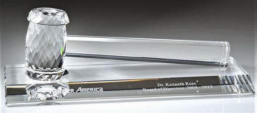 Crystal Gavel on Clear Crystal Base. Gavel: 3.3"X2"X10.3"; Base: 0.8"X4"X12". Packaged in a deluxe lined presentation box. Deep Etch Sand Engrav...