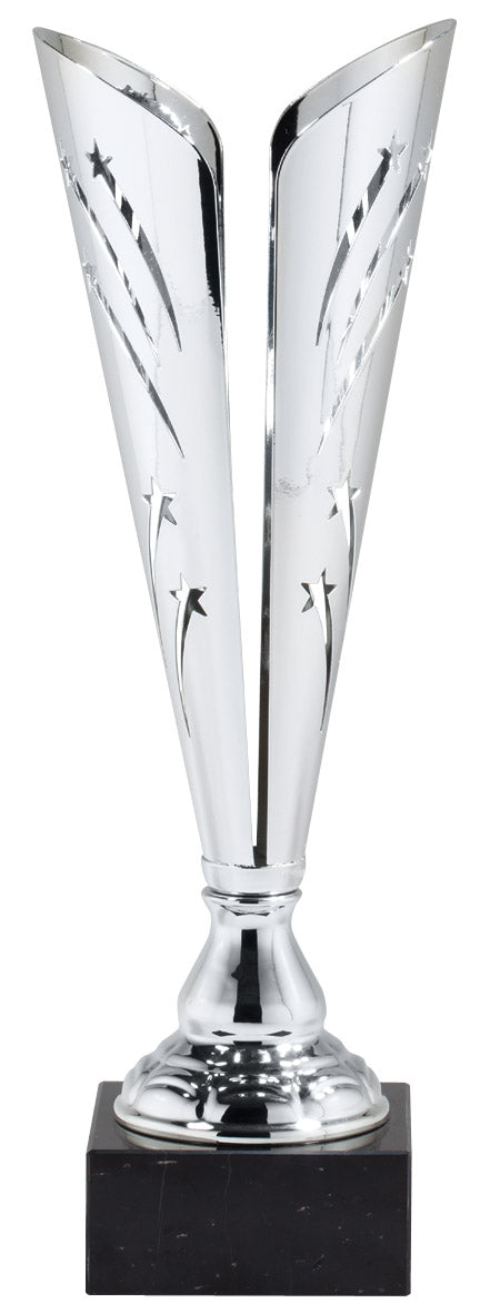 Silver Metal Trophy Cup with Gold Wave. Includes 2" Round Insert Topper and Engraving plate on base. Metal cup, plastic stem and base. Engraving...