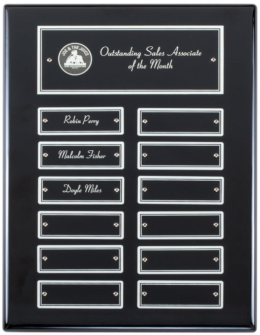12 Name Black Piano Finish Perpetual Plaque with UV Printing. 12"H X 9"W. This plaque is unique not using any metal nameplates, but printed dire...